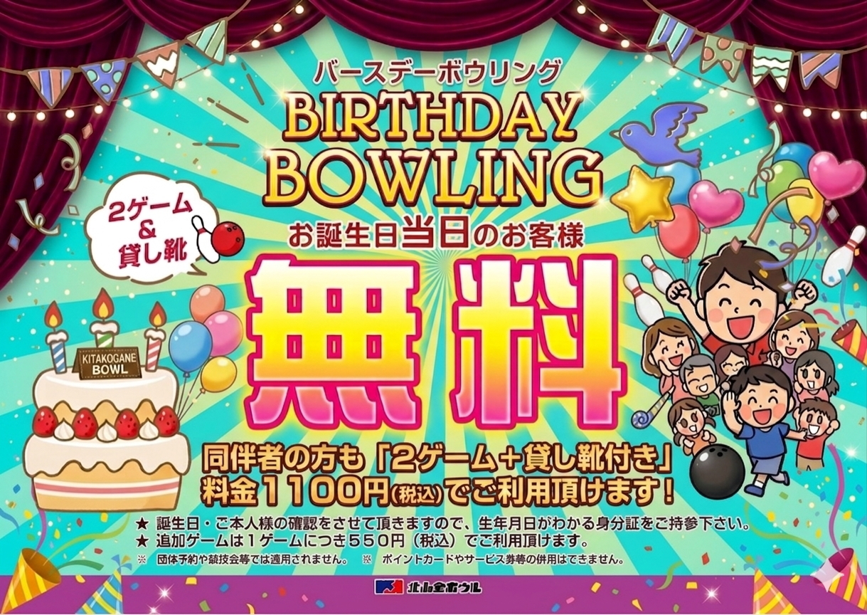お誕生日のお客様「2ゲーム+貸し靴」無料!